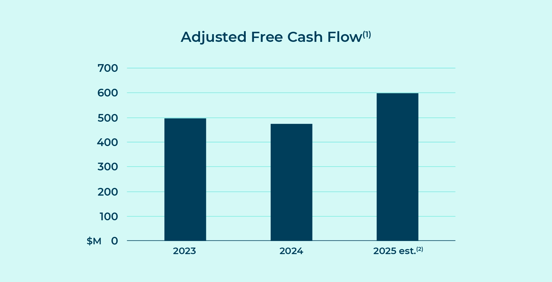 The Company is projected to generate more than $585M of adjusted free cash flow in FY 2025(1) (2), an increase of more than $100M year-on-year. We believe this expected cash flow will provide the company with ample flexibility to reduce leverage, buyback stock and support its dividend while investing in growth.